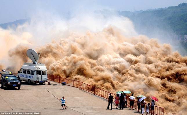 Ezek a hihetetlen képek Kína, Henan tartományában készültek a Sárga folyó egyik víztározójánál, a Xiaolangdi gátnál. Minden évben kinyitják a Hsziaolangdi (Xiaolangdi) völgyzáró gát zsilipeit. A hirtelen letóduló vízzel tisztítják a Sárga-folyót a rengeteg üledéktől, valamint így akadályozzák meg, hogy a hirtelen esőzések után a 2010-eshez hasonló, több ezer életet követelő hatalmas áradások öntsék el a tartományt. Átlagosan 30 millió tonna üledéket mozgatnak át az éves tisztítás során.