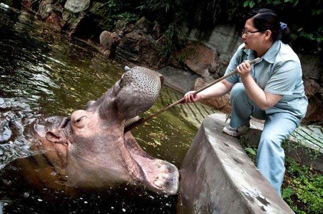 A következő képek főszereplője a Shanghai Állatkert vízilova, aki békésen tűri a fogmosást. Az állatkert egyik munkatársa, Pan Xiuwen elmondta, hogy a vízilovak foga általában nem szorul tisztításra, mivel leginkább fűfélékkel táplálkoznak, de az állatkertben élő hatalmas nílusi víziló gyümölcsöket és zöldségeket is kap, amiknek darabjai a fogai közé ragadhatnak, ezért van szükség a barátságos állat fogainak tisztítása.