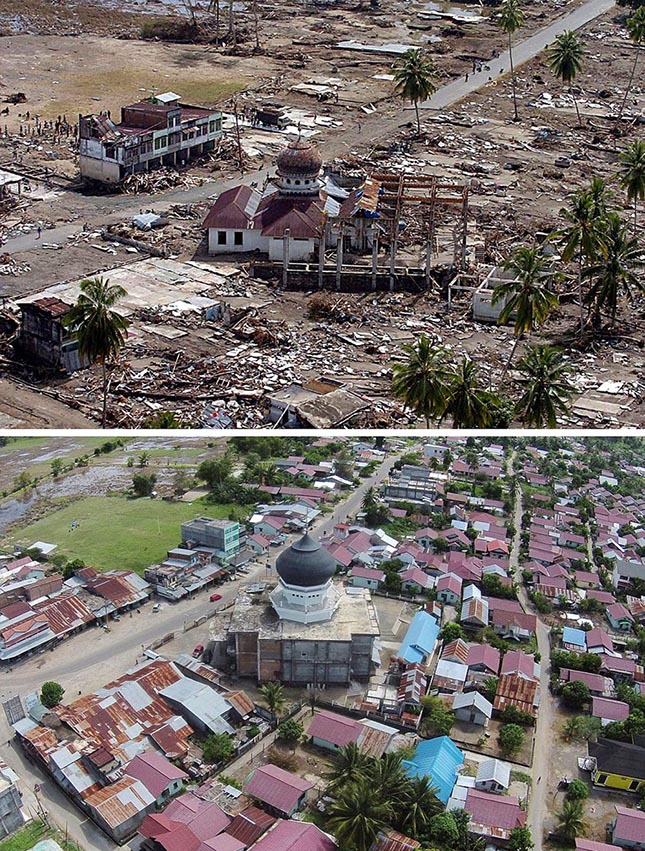 Az akkor készült fotók bejárták a világsajtót. Most újra elővették azokat és melléjük fotózták, hogy hogyan néznek ki most a 10 évvel ezelőtt katasztrófa sújtotta területek.
