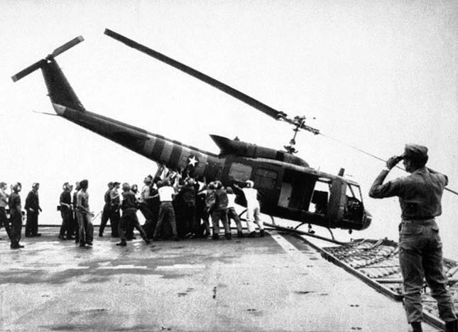 1975-ben a Saigoni nagy evakuálás idején az amerikai anyahajó fedélzetéről helikoptereket löktek a vízbe, hogy minél több hegy legyen a menekültek számára, akiknek már nem volt hová visszatérni a szárazföldön.