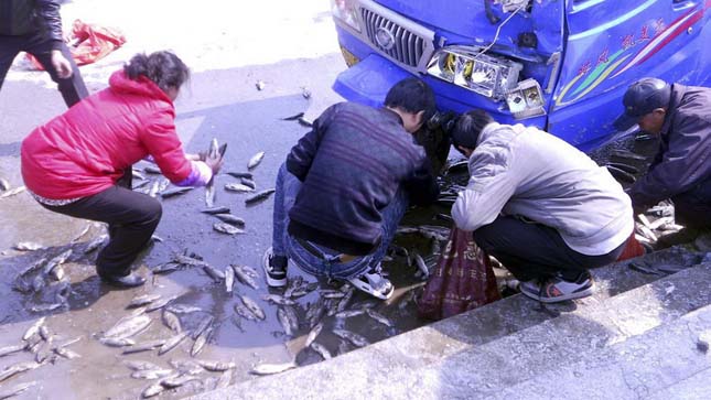 Kínában a közúti balesetek következtében leesett és összetört árukat a környéken élő lakosság percek alatt széthordja. Több esetben az emberek a segítség nyújtása vagy a mentők hívása helyett a saját önző érdekeiket helyezik előtérbe. A rendőrségnek gyakran kell figyelmeztető lövésekkel megállítani az embereket, akik minden lelkiismeret nélkül a balesetben megsérült sofőrök megsegítése helyett rögtön fosztogatni kezdenek.