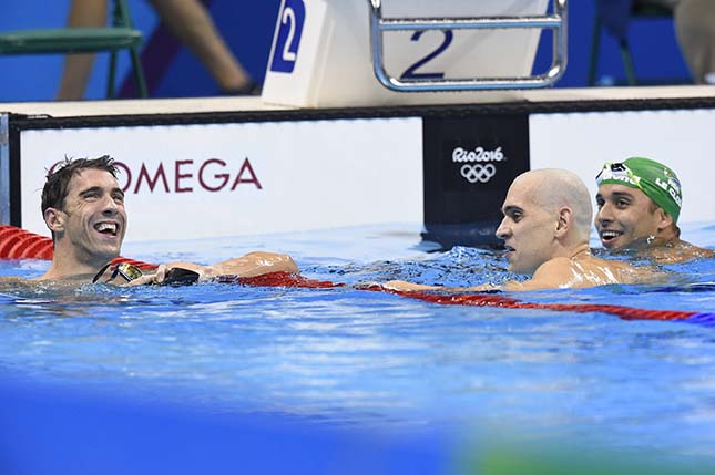 A férfiaknál Michael Phelps lett az év úszója (A fotón Michael Phelps, Cseh László és Chad Le Clos látható a férfi 100 méteres pillangóúszás döntőjében a riói olimpián, ahol a három úszó holtversenyben ezüstérmet nyert /MTI Fotó: Kovács Tamás)
