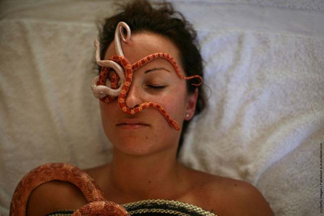 A legtöbb embert valószínűleg a frász törné ki, ha kígyók csúszkálnának a hátán, azonban a különleges kezelés alkalmazója szerint csodálatosan oldják a stresszt. Egy izraeli nő egészen új felhasználási módját találta a kígyóknak: ő kezdett el először masszírozni velük. Ada Barak, egy izraeli fizikoterapeuta, aki spa szalonjában kígyómasszázst kínál vendégeinek. A kezelés során a páciens fáradt izmait hat királypiton masszírozza végig, szó szerint hátborzongatóan. A nyak, a váll és a hát izmait csodálatosan ellazítja a kígyók körkörös tekergőzése, és a kezelés állítólag minden eddiginél jobban oldja a stresszt, ami a nyak izmainak csomósodását okozza.