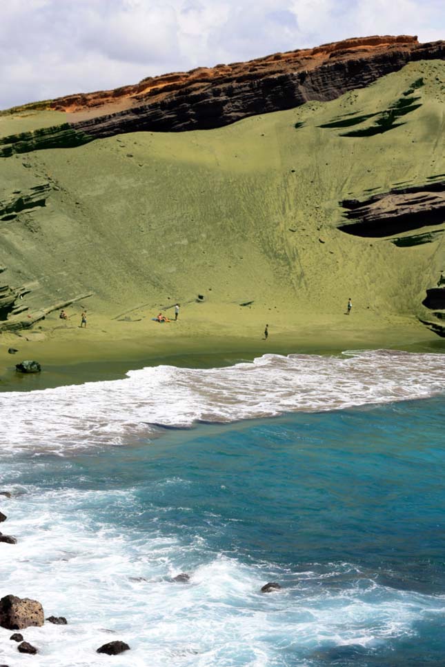 Papakolea, Ka Lae közelében fekszik, ami Hawaii és egyben az USA legdélebbi pontja. Megközelítése nem egyszerű, hiszen kilométereket kell gyalogolni a melegben a meredek sziklák között. Az erőfeszítés azonban kifizetődik amint megérkezünk a különleges tengerpartra, melyet egyik oldalról egy vulkáni kúp határol. Szinte teljes egészében apró olivine kristályok alkotta homok borítja a partot, mely élénk zöld színben pompázik. A Papakolea strand homokjának zöld színét a sziget vulkanikus aktivitása során keletkező ásványoknak köszönheti. A szigeten található a Mauna Loa pajzsvulkán, a sziget második legmagasabb vulkáni kúpja. Több mint tízezer évvel ezelőtt a vulkánkitörésekkel több tonna ásványi anyag került a felszínre, beleértve a rengeteg olivint. Az olivin egy ásványcsoport, amely a nevét olajzöld színéről kapta.