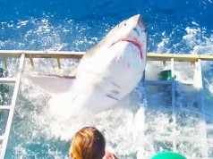 Félelmetes pillanatokban volt része egy cápalesre érkező turistacsoportnak a mexikói Guadalupe-sziget közelében. Egy ketreces búvárkodás során a búvároknak sikerült egy nagy fehér cápát odacsalogatniuk a turistákkal teli hajóhoz tonhal segítségével, ám a ragadozó a reméltnél jóval közelebb merészkedett. A hatalmas cápa ugyanis véletlenül betört a ketrec...