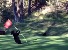 Kanada Brit Columbia tartományában található a Fairmont Hot Springs Resort üdülőhely, ahol a videót készítő Andi Dzilums szerint mostanában egyre gyakrabban jelennek meg és hűsölnek a közelben élő medvék. Nemrégiben ismét feltűntek, ez alkalommal egy játékos kedvű, fiatal medve úgy döntött, hogy közelebbről megnézni magának a golfpályát. Először a zászl...