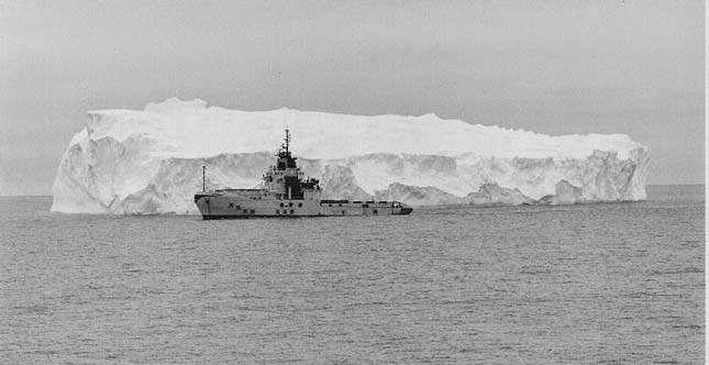 A Maersk Master vontatóhajó egy kb. 12 millió tonnás jéghegyet vontat (1987. február)